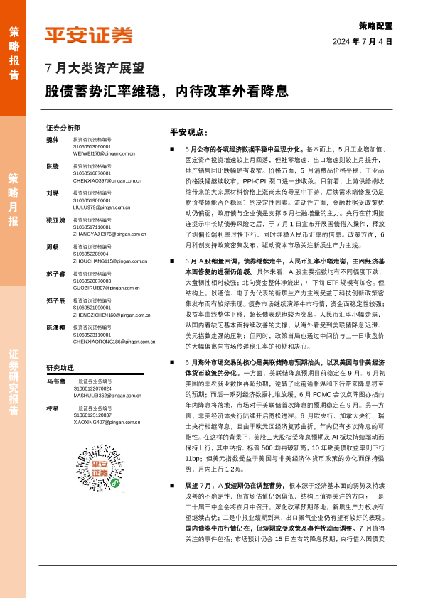 【平安证券】【20240704】7月大类资产展望:股债蓄势汇率维稳,内待改革外看降息-27页