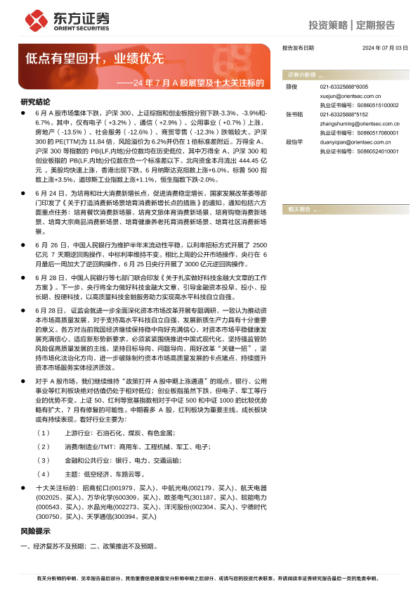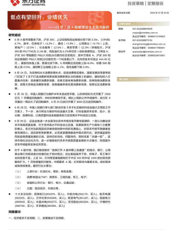 【东方证券】【20240703】24年7月A股展望及十大关注标的:低点有望回升,业绩优先-13页