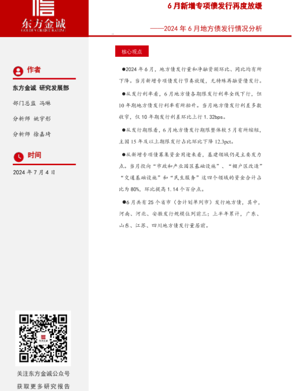 【东方金诚】【20240704】2024年6月地方债发行情况分析:6月新增专项债发行再度放缓-10页