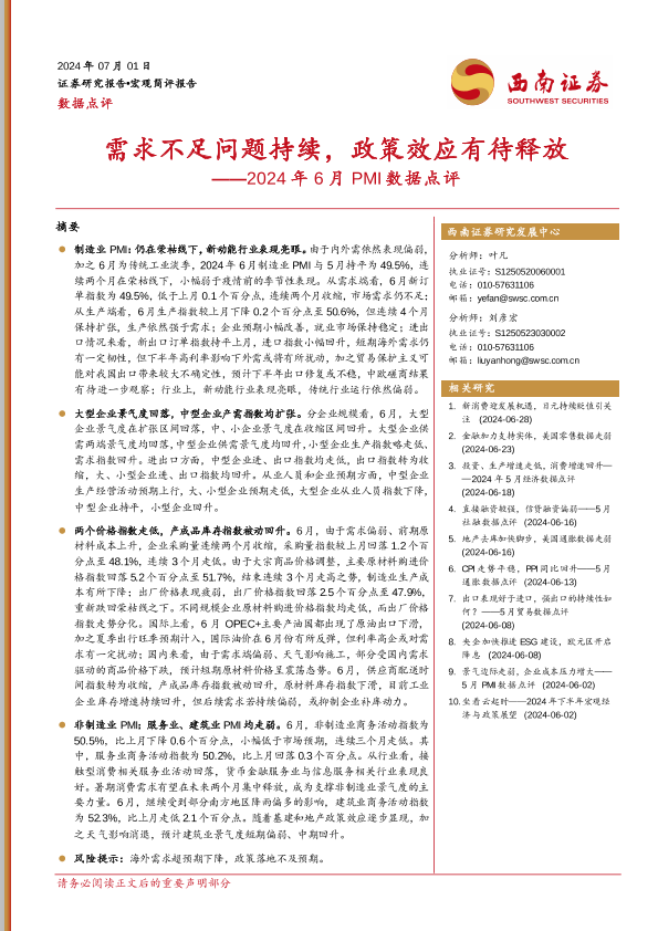【西南证券】【20240701】2024年6月PMI数据点评:需求不足问题持续,政策效应有待释放-10页