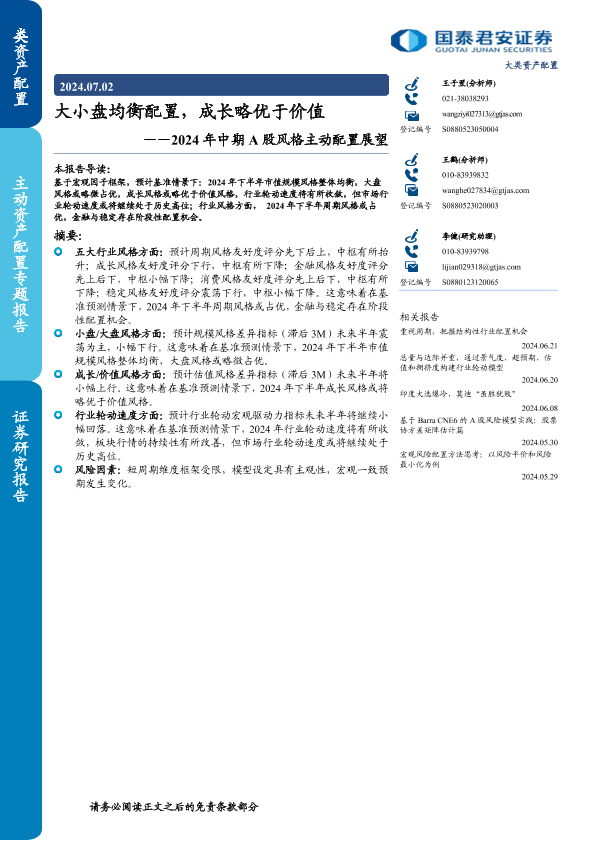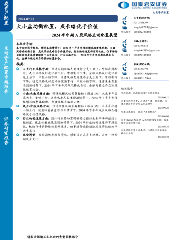 【国泰君安证券】【20240702】2024年中期A股风格主动配置展望:大小盘均衡配置,成长略优于价值-20页