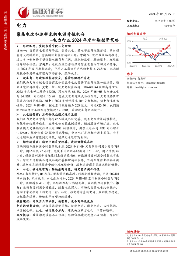 【国联证券】【20240629】电力行业2024年度中期投资策略:聚焦电改加速带来的电源升值机会-28页