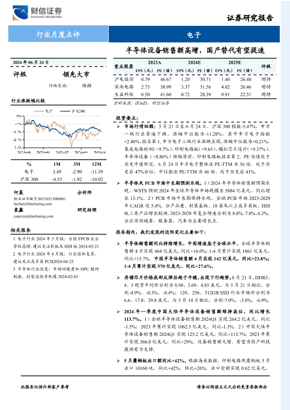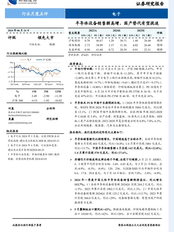 【财信证券】【20240624】电子行业月度点评:半导体设备销售额高增,国产替代有望提速-19页