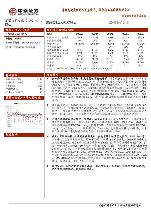 【中泰证券】【20240628】复星旅游文化(1992.HK)复星旅文首次覆盖报告:看好高端度假龙头发展潜力,低估值体现价值投资空间-15页