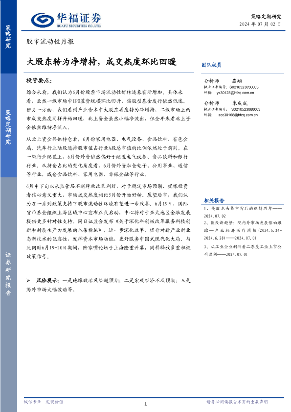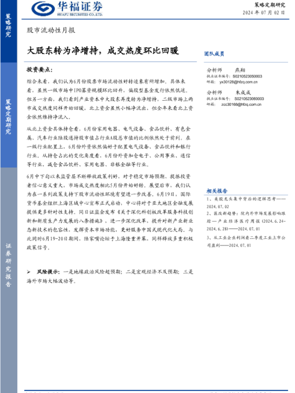【华福证券】【20240702】股市流动性月报:大股东转为净增持,成交热度环比回暖-13页