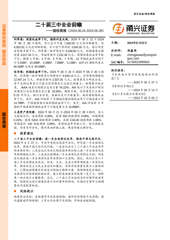 二十届三中全会 信用债 利率债 固收周报 宏观经济