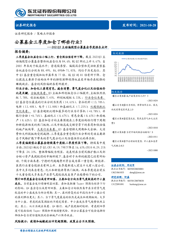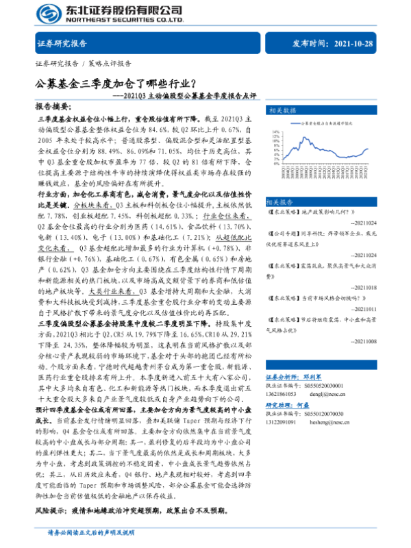 【东北证券】【20211028】2021Q3主动偏股型公募基金季度报告点评:公募基金三季度加仓了哪些行业?-18页