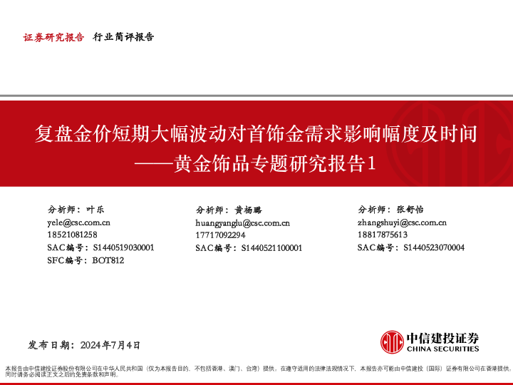 【中信建投证券】【20240704】黄金饰品行业专题研究报告1:复盘金价短期大幅波动对首饰金需求影响幅度及时间-14页