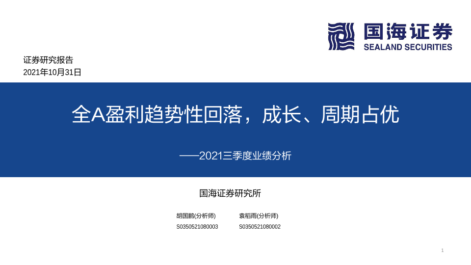 【国海证券】【20211031】2021三季度业绩分析:全A盈利趋势性回落,成长、周期占优-35页