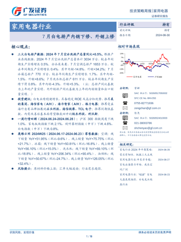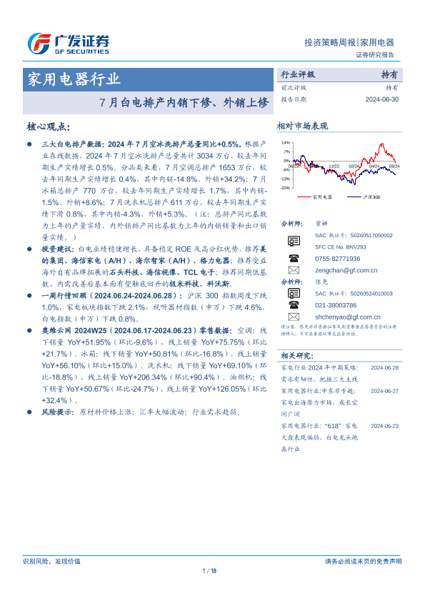 【广发证券】【20240630】家用电器行业:7月白电排产内销下修、外销上修-18页