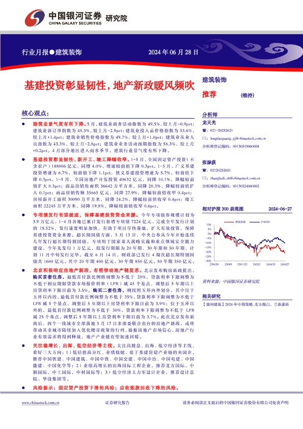 【银河证券】【20240628】建筑装饰行业月报:基建投资彰显韧性,地产新政暖风频吹-18页