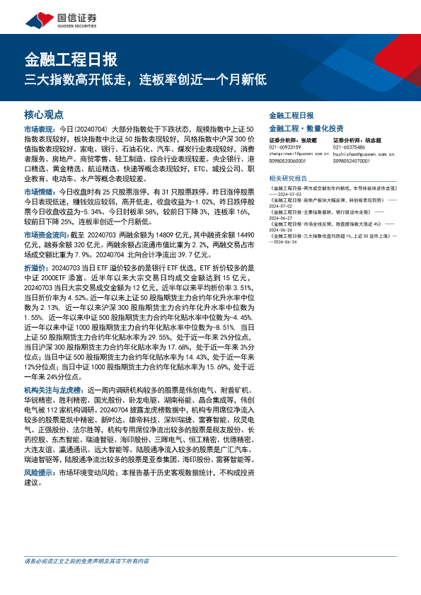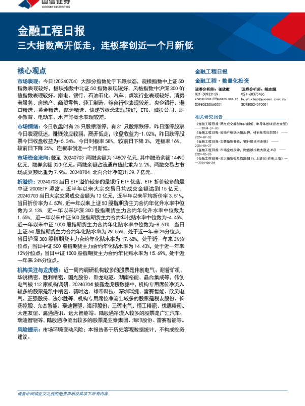 【国信证券】【20240704】金融工程:三大指数高开低走,连板率创近一个月新低-15页