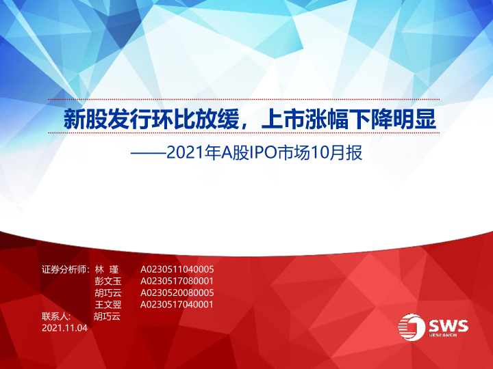 【申万宏源】【20211104】2021年A股IPO市场10月报:新股发行环比放缓,上市涨幅下降明显-18页