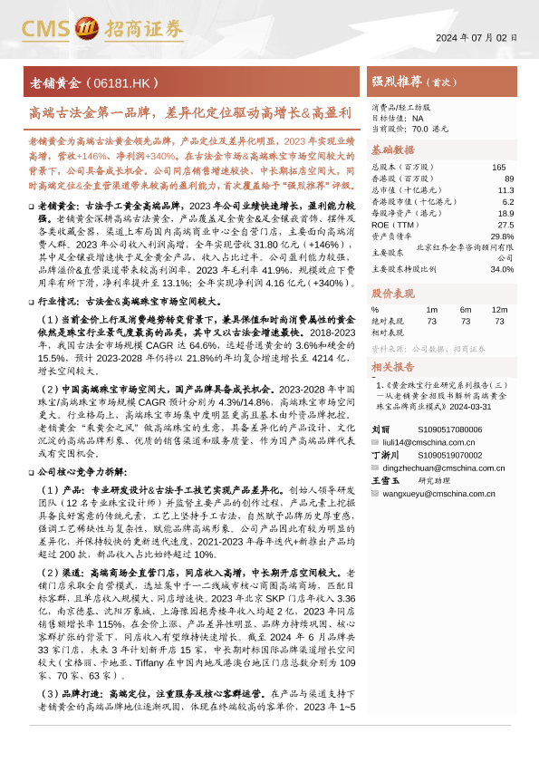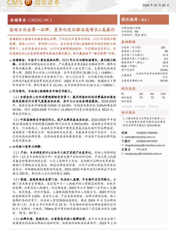 【海通证券】【20240702】老铺黄金(06181.HK)高端古法金第一品牌,差异化定位驱动高增长&高盈利-23页