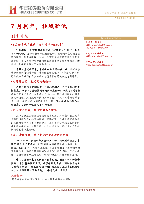 【华西证券】【20240630】利率月报:7月利率,挑战新低-15页