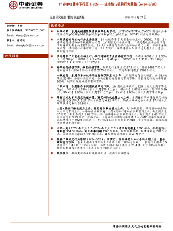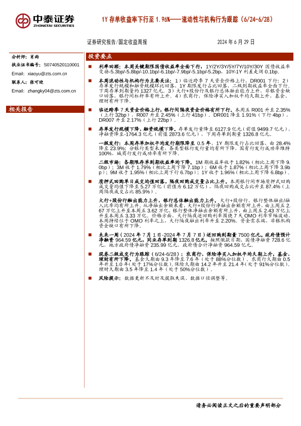 【中泰证券】【20240629】流动性与机构行为跟踪:1Y存单收益率下行至1.96%-13页
