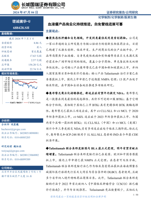 【长城国瑞证券】【20240704】诺诚健华-U(688428)血液瘤产品商业化持续推进,自免管线进展可喜-50页