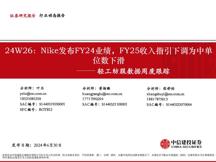 【中信建投证券】【20240630】轻工纺服行业数据跟踪-24W26:Nike发布FY24业绩,FY25收入指引下调为中单位数下滑-42页