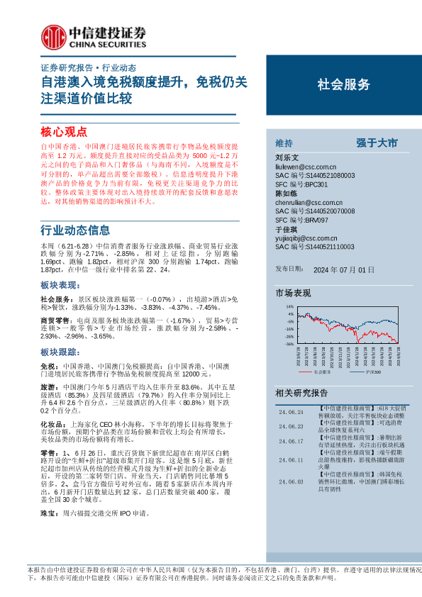 【中信建投证券】【20240701】社会服务行业:自港澳入境免税额度提升,免税仍关注渠道价值比较-30页