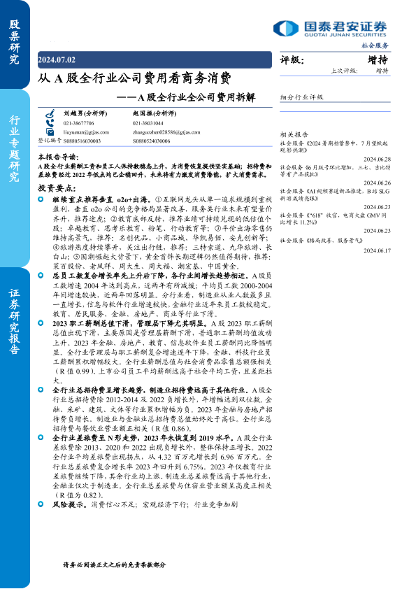 【国泰君安证券】【20240702】社会服务行业A股全行业全公司费用拆解:从A股全行业公司费用看商务消费-28页