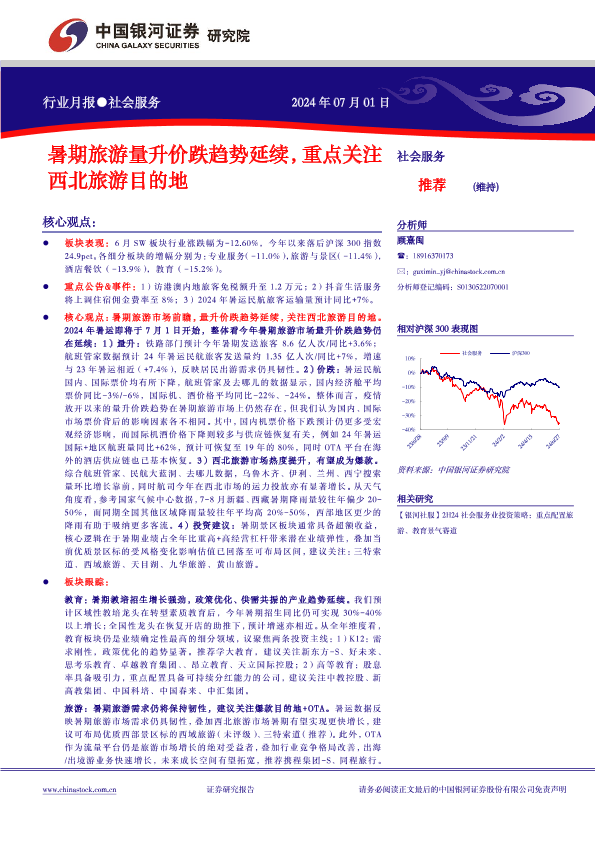 【银河证券】【20240701】社会服务行业月报:暑期旅游量升价跌趋势延续,重点关注西北旅游目的地-13页
