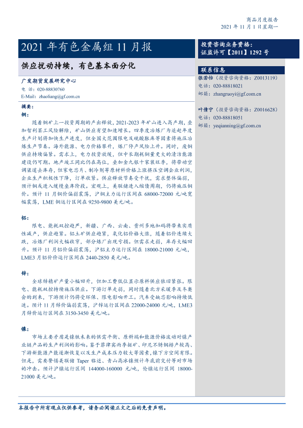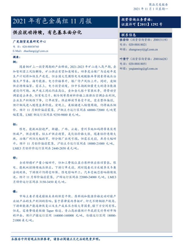 【广发期货】【20211101】2021年有色金属组11月报:供应扰动持续,有色基本面分化-29页