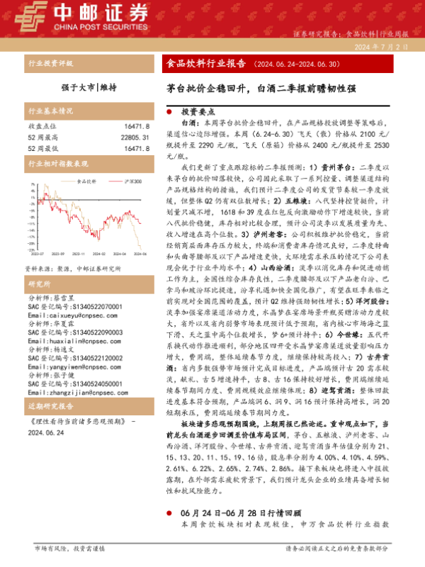 【中邮证券】【20240702】食品饮料行业报告:茅台批价企稳回升,白酒二季报前瞻韧性强-19页