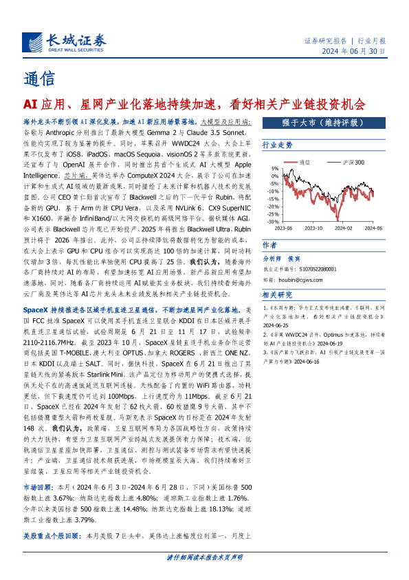 【长城证券】【20240630】通信行业月报:AI应用、星网产业化落地持续加速,看好相关产业链投资机会-17页