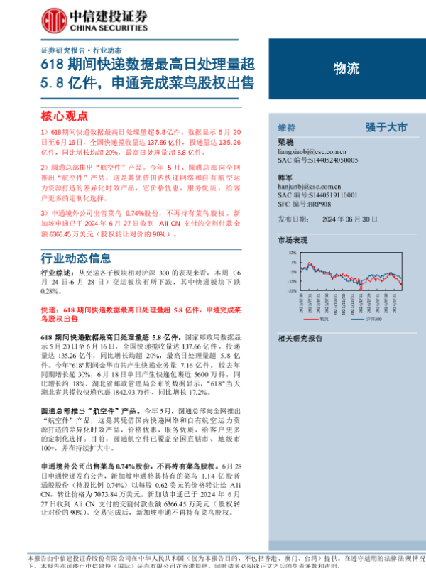 【中信建投证券】【20240630】物流行业:618期间快递数据最高日处理量超5.8亿件,申通完成菜鸟股权出售-21页