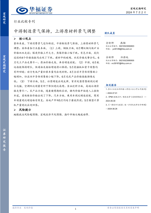 【华福证券】【20240702】行业比较专刊:中游制造景气保持,上游原材料景气调整-20页