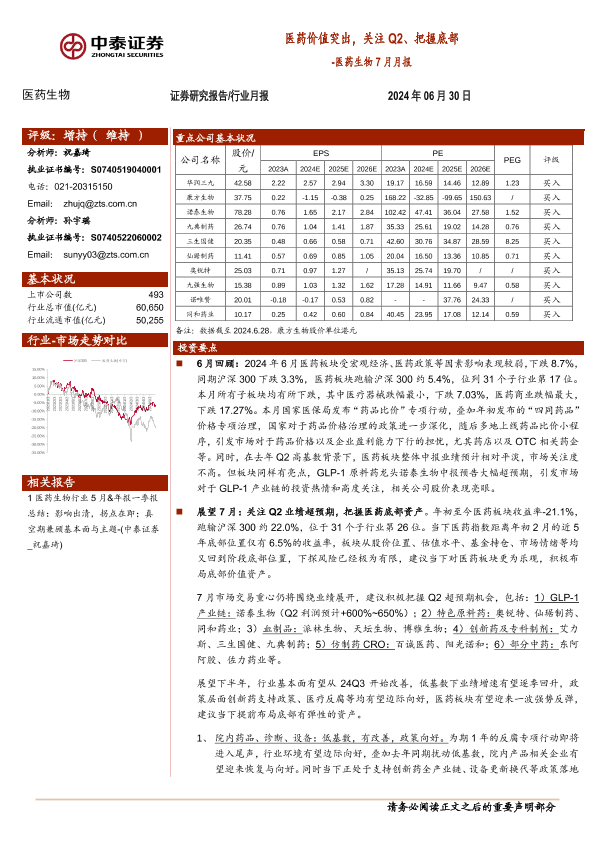 【中泰证券】【20240630】医药生物行业7月月报:医药价值突出,关注Q2、把握底部-16页