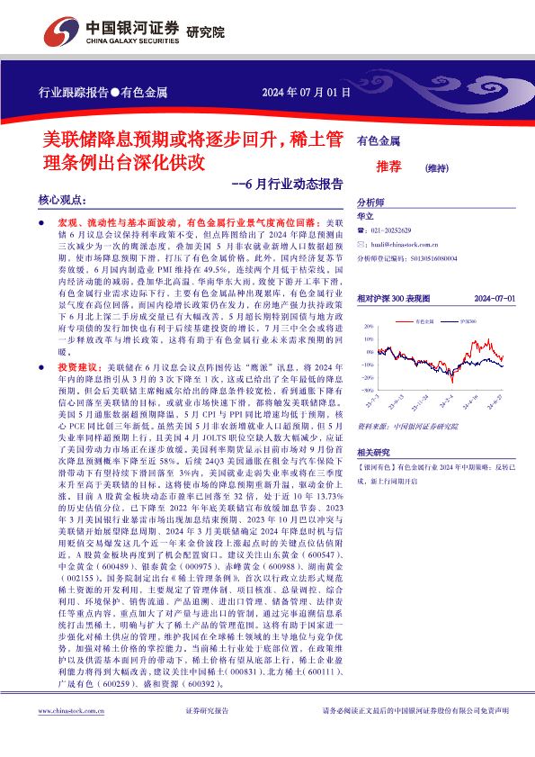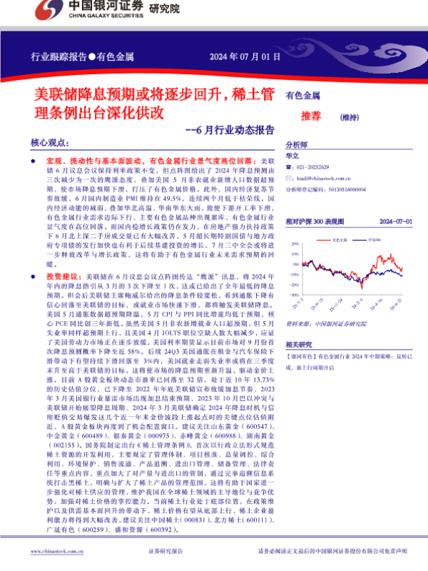 【银河证券】【20240701】有色金属行业6月行业动态报告:美联储降息预期或将逐步回升,稀土管理条例出台深化供改-25页