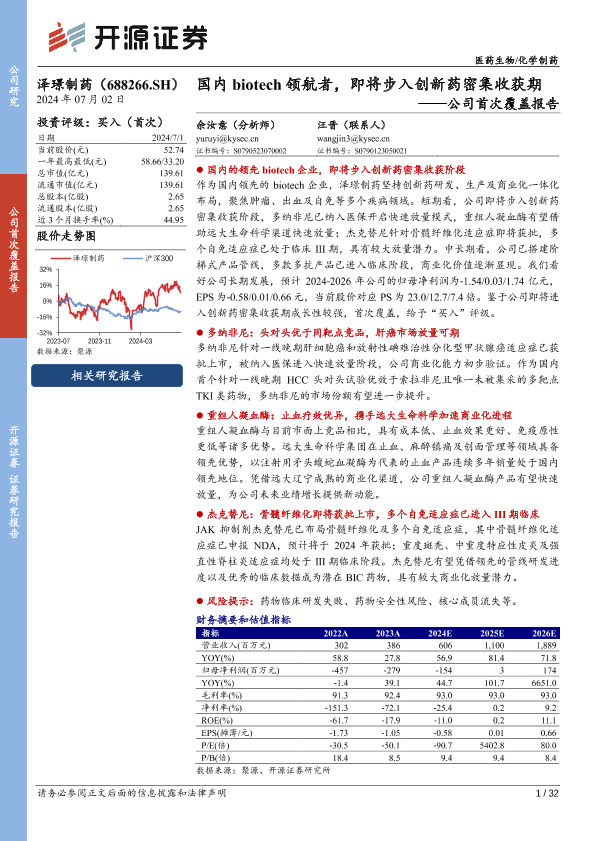【开源证券】【20240702】泽璟制药(688266)公司首次覆盖报告:国内biotech领航者,即将步入创新药密集收获期-32页