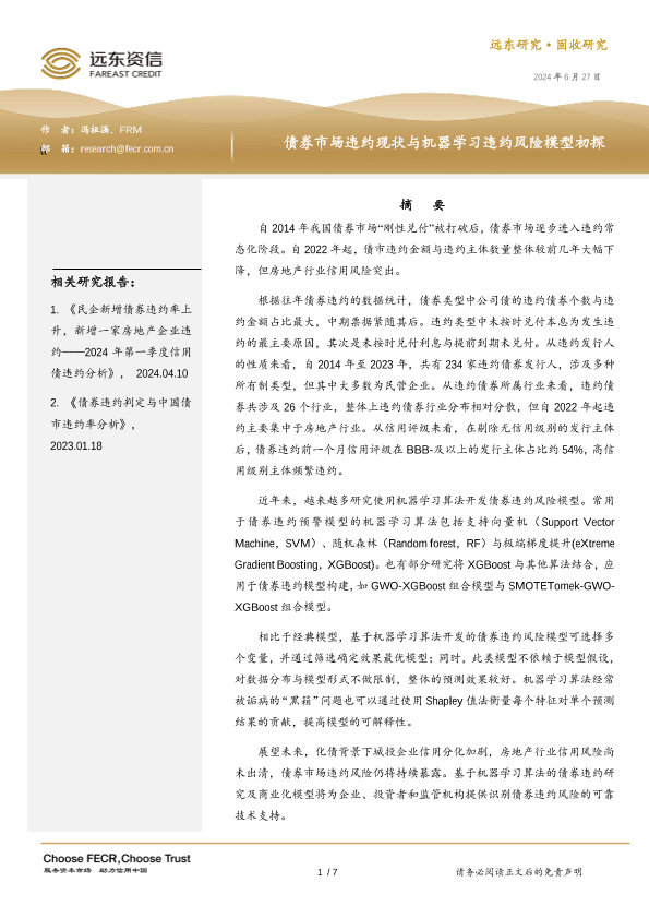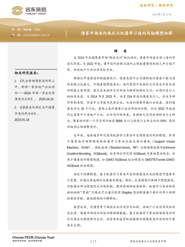【远东资信】【20240627】债券市场违约现状与机器学习违约风险模型初探-10页