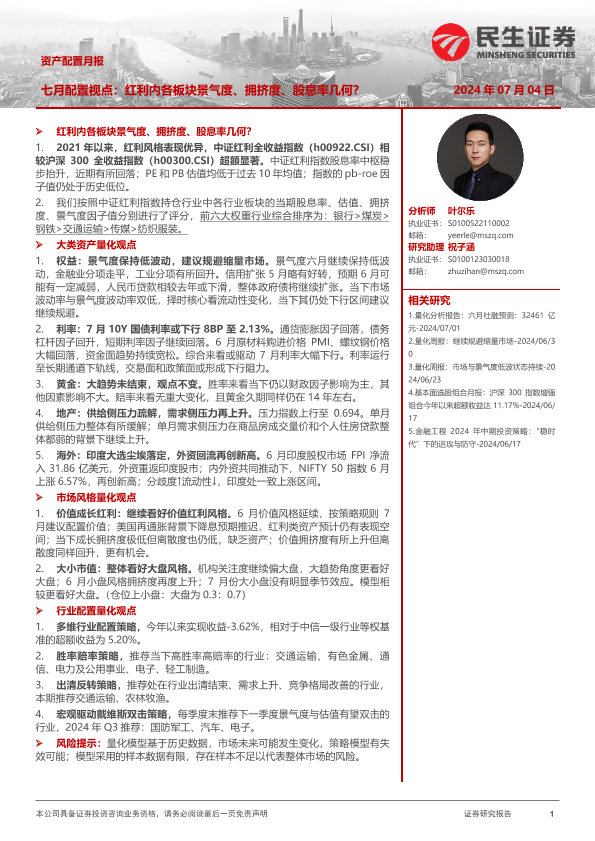 【民生证券】【20240704】资产配置月报-七月配置视点:红利内各板块景气度、拥挤度、股息率几何?-37页