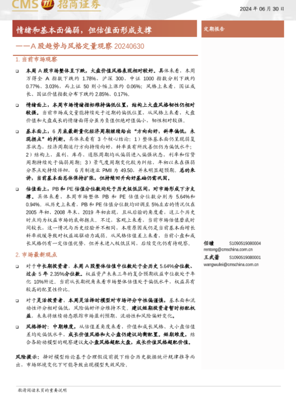 【海通证券】【20240630】A股趋势与风格定量观察:情绪和基本面偏弱,但估值面形成支撑-11页