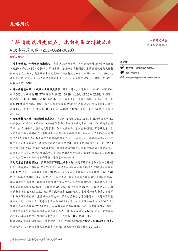 【西部证券】【20240630】A股市场周观察:市场情绪达历史低点,北向交易盘持续流出-27页