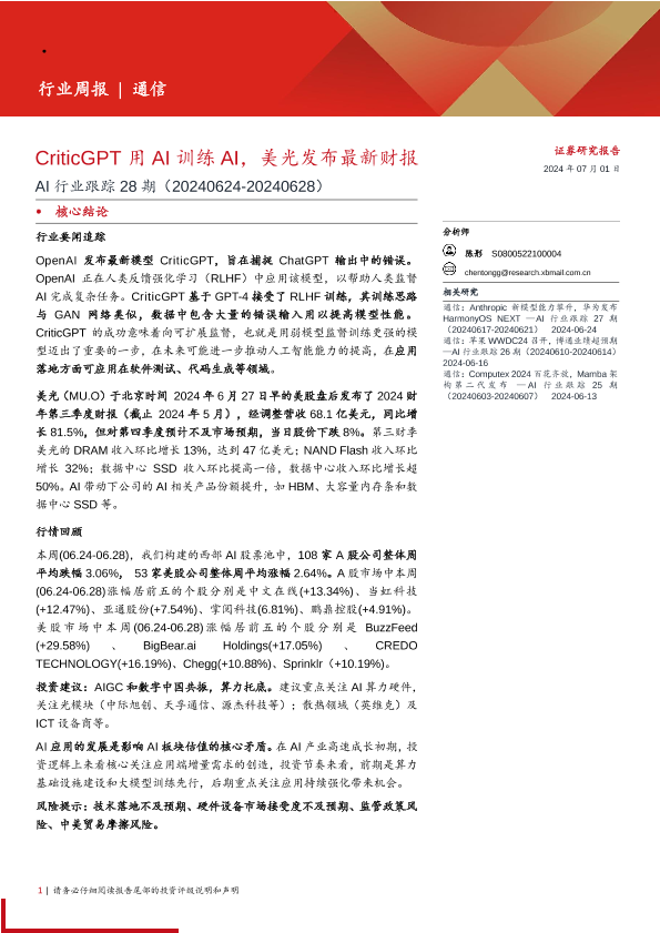【西部证券】【20240701】AI行业跟踪28期:CriticGPT用AI训练AI,美光发布最新财报-13页