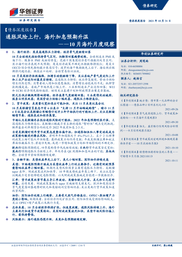 【华创证券】【20211031】10月海外月度观察:通胀风险上行,海外加息预期升温-30页