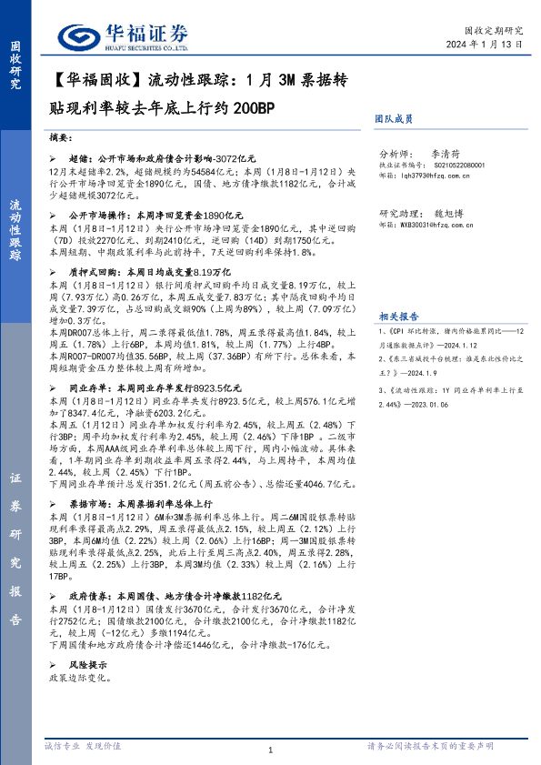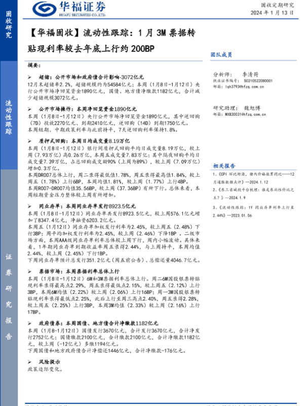 【华福证券】【20240113】【华福固收】流动性跟踪:1月3M票据转贴现利率较去年底上行约200BP-12页