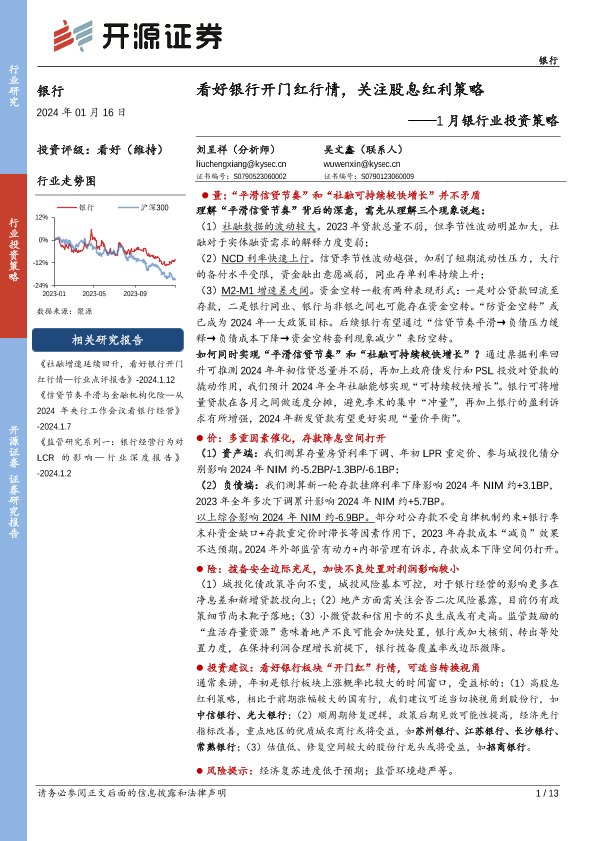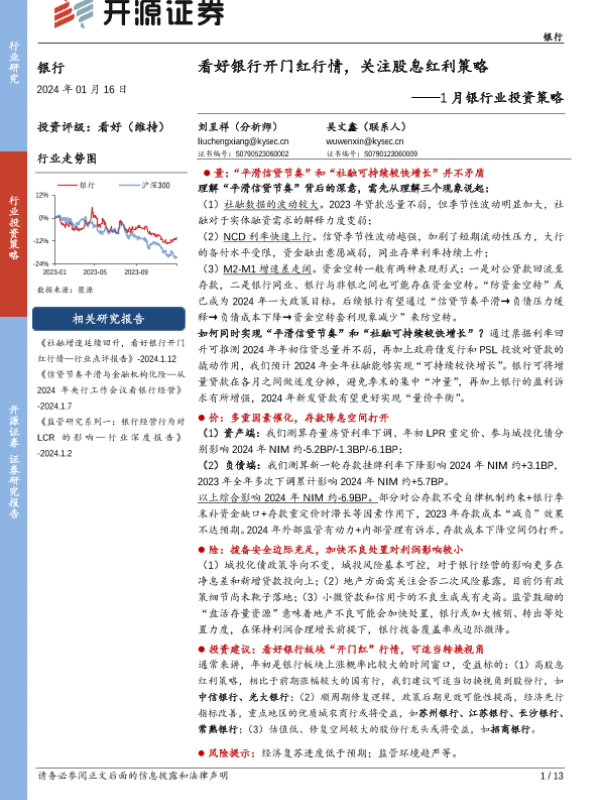 【开源证券】【20240116】1月银行业投资策略:看好银行开门红行情,关注股息红利策略-13页