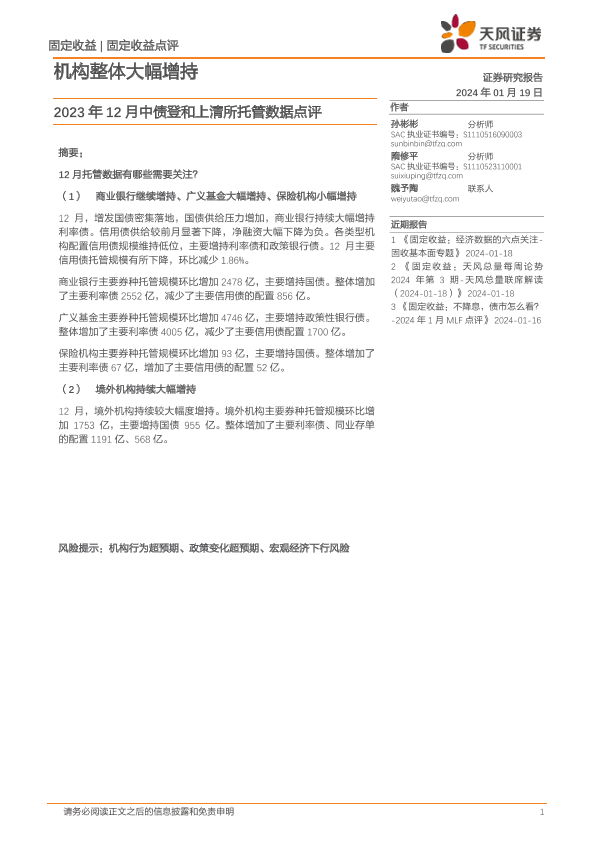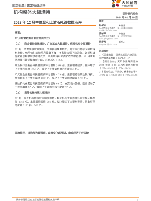 【天风证券】【20240119】2023年12月中债登和上清所托管数据点评:机构整体大幅增持-12页
