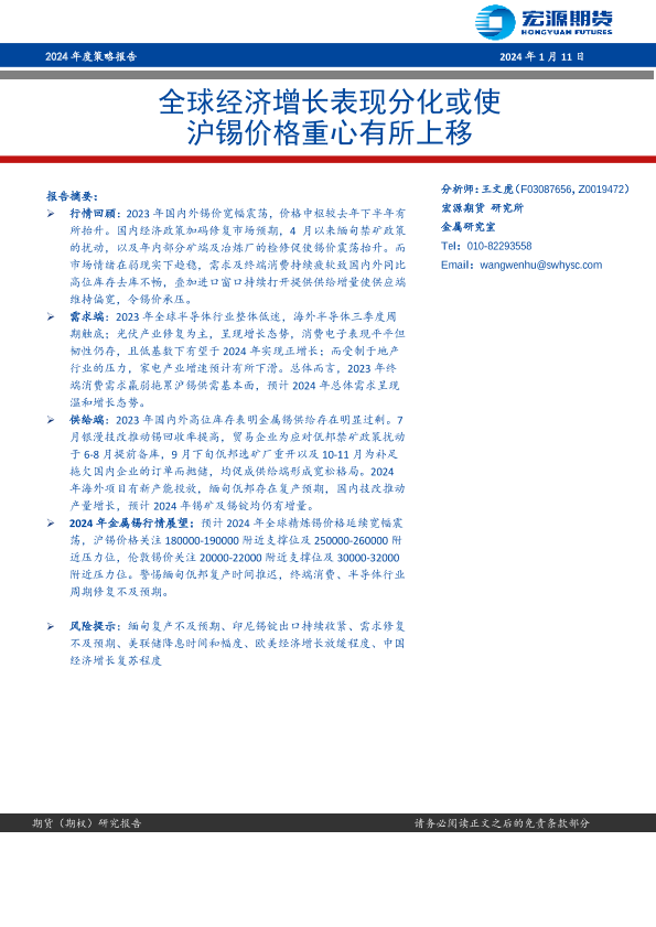 【宏源期货】【20240111】2024年度策略报告:全球经济增长表现分化或使沪锡价格重心有所上移-18页