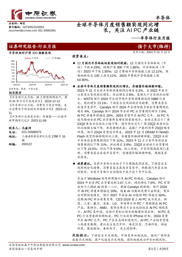 【中原证券】【20240112】全球半导体月度销售额实现同比增长,关注AI PC产业链-29页
