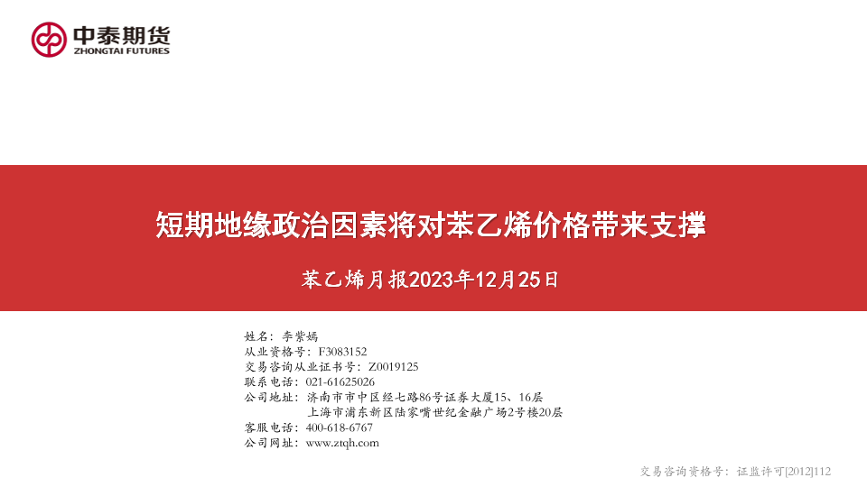 【中泰期货】【20231225】苯乙烯月报:短期地缘政治因素将对苯乙烯价格带来支撑-18页