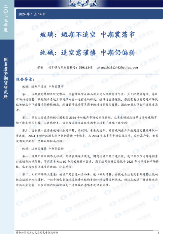 【国泰君安期货】【20240114】玻璃:短期不追空 中期震荡市 纯碱:追空需谨慎 中期仍偏弱-15页