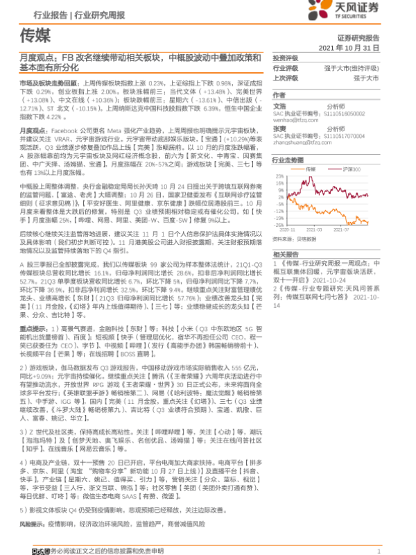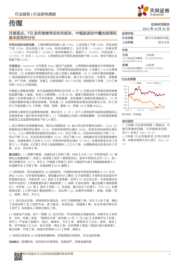 【天风证券】【20211031】传媒行业月度观点:FB改名继续带动相关板块,中概股波动中叠加政策和基本面有所分化-15页