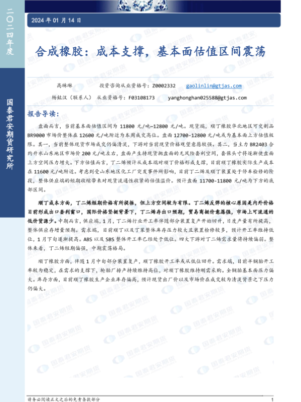 【国泰君安期货】【20240114】合成橡胶:成本支撑,基本面估值区间震荡-12页