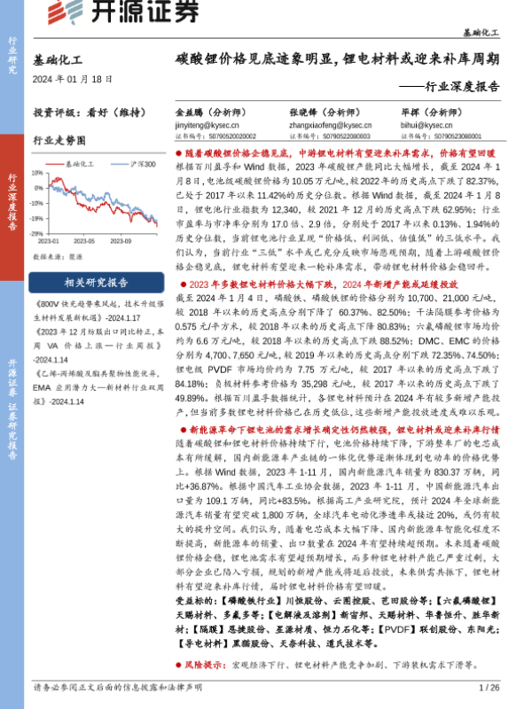 【开源证券】【20240118】基础化工行业深度报告:碳酸锂价格见底迹象明显,锂电材料或迎来补库周期-26页