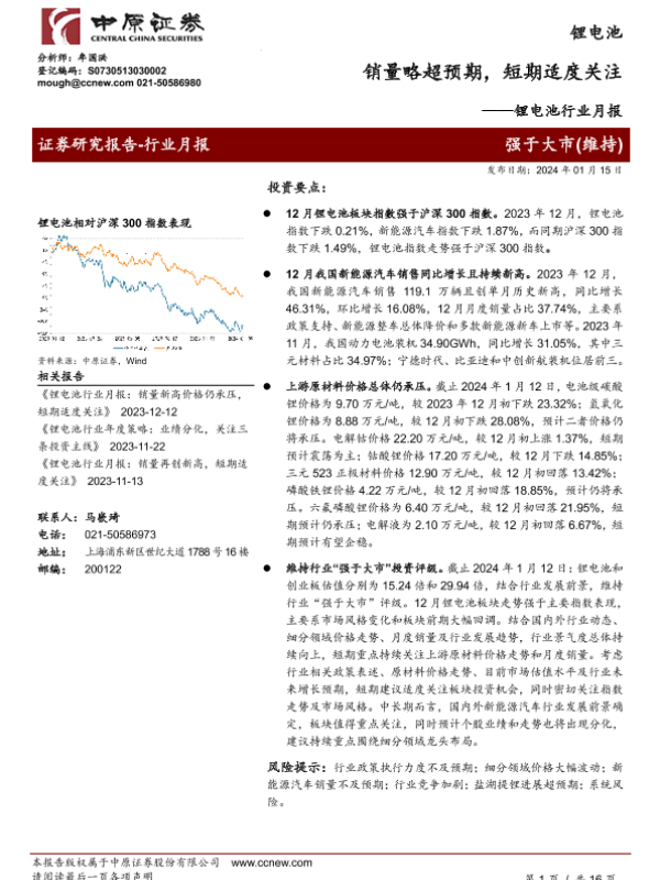 【中原证券】【20240115】锂电池行业月报:销量略超预期,短期适度关注-16页